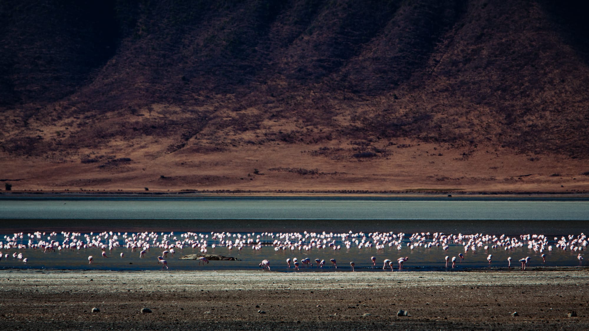 Zacznijmy od tego, że raczej nie zobaczysz ich w różowych zbiornikach (albo przynajmniej my ich tam nie widzieliśmy). Myślę, że tam po prostu stężenie soli jest dla nich za duże. Zatem gdzie ich szukać. Flamingi brodzą sobie w wodzie, kilka kilometrów dalej w