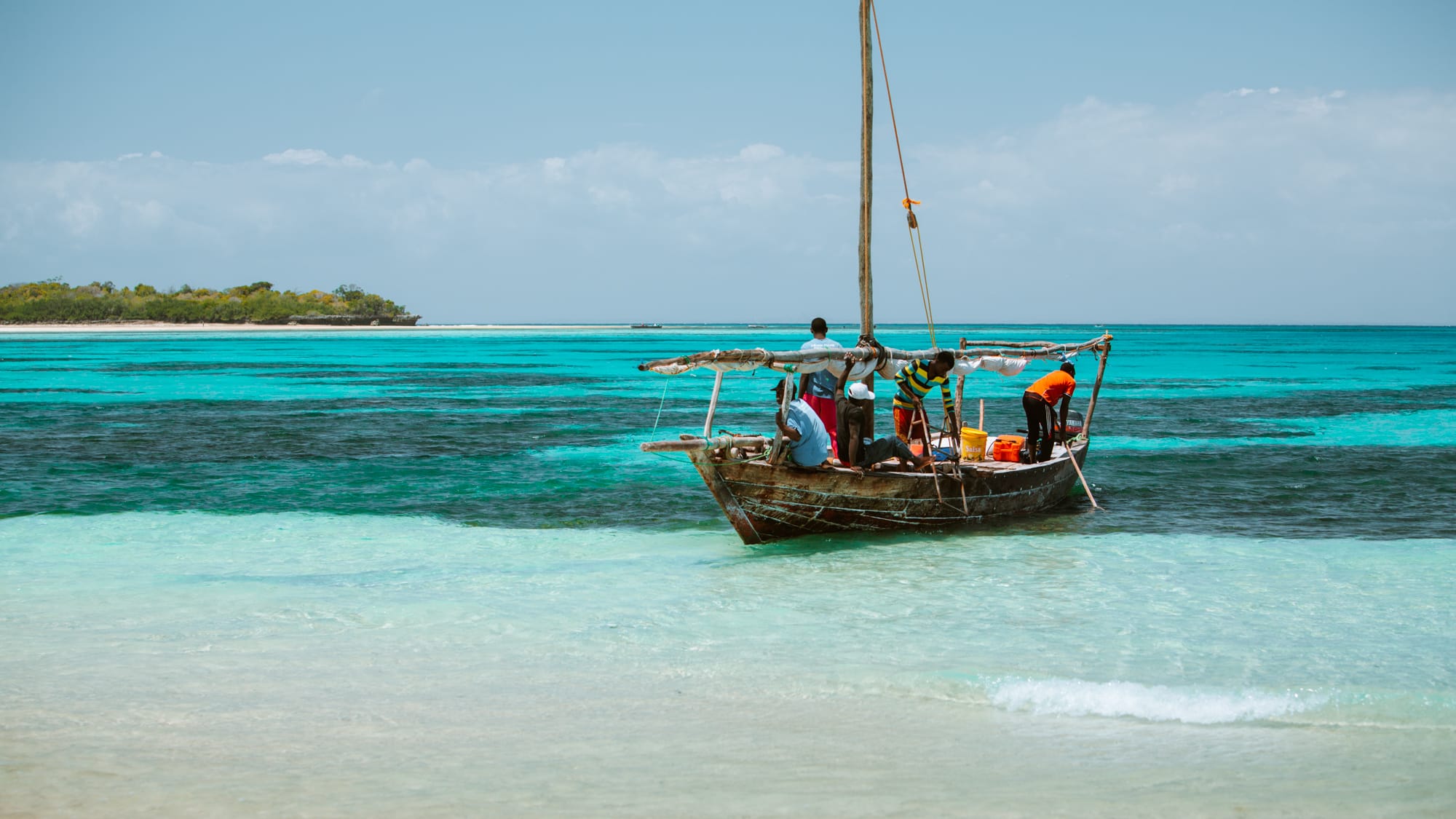 Dzień drugi przywitał nas tak samo piękną pogodą jak dzień pierwszy…Jak tylko otwarłam oczy to od razu patrzyłam czy przez szparę od drzwi przebija słońce…:) Szybko zjedliśmy śniadanko, bo o 8:30 byliśmy umówieni z naszym beach boyem Ally, który o dziwo przyjechał bardzo punktualnie. Aż się zdziwiłam, bo jestem przyzwyczajona do tego, że w Afryce to wszyscy mają czas i wszędzie się spóźniają. Ledwo weszliśmy do samochodu, a Ally pyta nas czy mamy dla niego pieniążki, bo benzyna w samochodzie się kończy i musimy najpierw zatankować. Ok, żaden problem dałam mu 50$, niestety musieliśmy najpierw podjechać do wioski i je wymieć na szylingi bo na stacji benzynowej $ zapłacić nie można. Dzięki temu, wjechaliśmy do wioski, do której chyba raczej turyści nie zaglądają, bo była ona z dala od głównej drogi. W sumie chyba nie chciałabym znaleźć się tam bez opieki przewodnika…widok, no cóż smutny…chciałam zrobić dla was kilka fotek, ale niestety Marcel mi surowo zabronił. Stwierdził, że to naruszanie ich prywatności. Ehhh…no to muszę wam zatem opisać co widziałam…bieda…bieda…straszna bieda. Domki lepianki…a przy nich biegające na bosaka dzieci…Aż serce się kroiło, kiedy widziałam te malutkie nóżki, całe brudne, w podartych ubrankach…Roczne dziecko, którego nikt nie ma czasu nakarmić, więc siedzi sobie z butelką w ręce i karmi się samo…kobiety ubrane w pięknych kolorowych sukniach…w chustach na głowie, jak to nakazuje ich religia. Życie toczy się na ulicy, widać, że Ally zna tutaj wszystkich. Kiedy w końcu udało się nam wymienić dolary, udaliśmy się na stację…a tu niespodzianka, na stacji skończyło się paliwo…a my już tak od dobrej pół godziny na oparach…ale nasz uśmiechnięty Ally woła Hakuna Matata – czyli no problem 🙂 wróciliśmy znowu do wioski, tym razem w poszukiwaniu benzyny…sprzedają, ja po prostu na litry…zastanawiacie się po co? Po pierwsze do motorów, których tam całkiem sporo się porusza, po drugie codziennie regularnie koło 20:00 w wiosce, oraz w naszym hotelu, wyłączają prąd, a wtedy w ruch idą agregaty, i to właśnie dlatego w kilku miejscach można kupić benzynę na litry. W końcu udało nam się zatankować…tzn…wlać do baku 5litrów 🙂 Mogliśmy zatem ruszyć spokojnie dalej. Co prawda myślałam, że zaraz dotankujemy na najbliższej stacji, ale tak się nie stało, wywnioskowałam więc, że chyba lubią jeździć na oparach 🙂 Do naszego celu, czyli do portu z którego musieliśmy wyruszyć było około godzinkę drogi. Spodziewałam się jakiejś plastikowej łódki i przynajmniej 20 towarzyszy wycieczki, jak to zwykle bywa na takich imprezach, a tutaj niespodzianka, czekała na nas prawdziwa rybacka łódź z drewnianym masztem i całkiem kameralna grupka 🙂 Wskoczyliśmy od razu na pokład i wyruszyliśmy. Trochę wiało i bujało tą skorupą, ale jakoś udało nam się dotrzeć na miejsce…